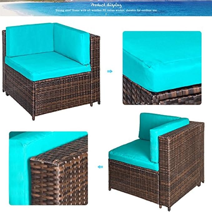 UNIROI 7 件式戶外藤條對話模組化組合式沙發和咖啡桌組,藍色坐墊/棕色柳條,附 2 個枕頭,非常適合花園/後院/門廊/池畔